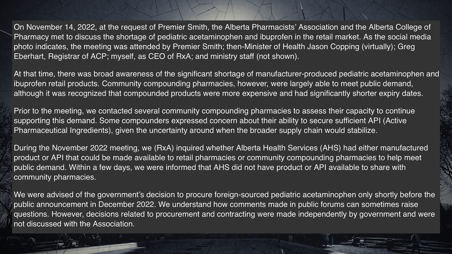 “We were advised of the government’s decision to procure foreign-sourced pediatric acetaminophen only shortly before the public announcement in December 2022. We understand how comments made in public forums can sometimes raise questions. However, decisions related to procurement and contracting were made independently by government and were not discussed with the Association.”